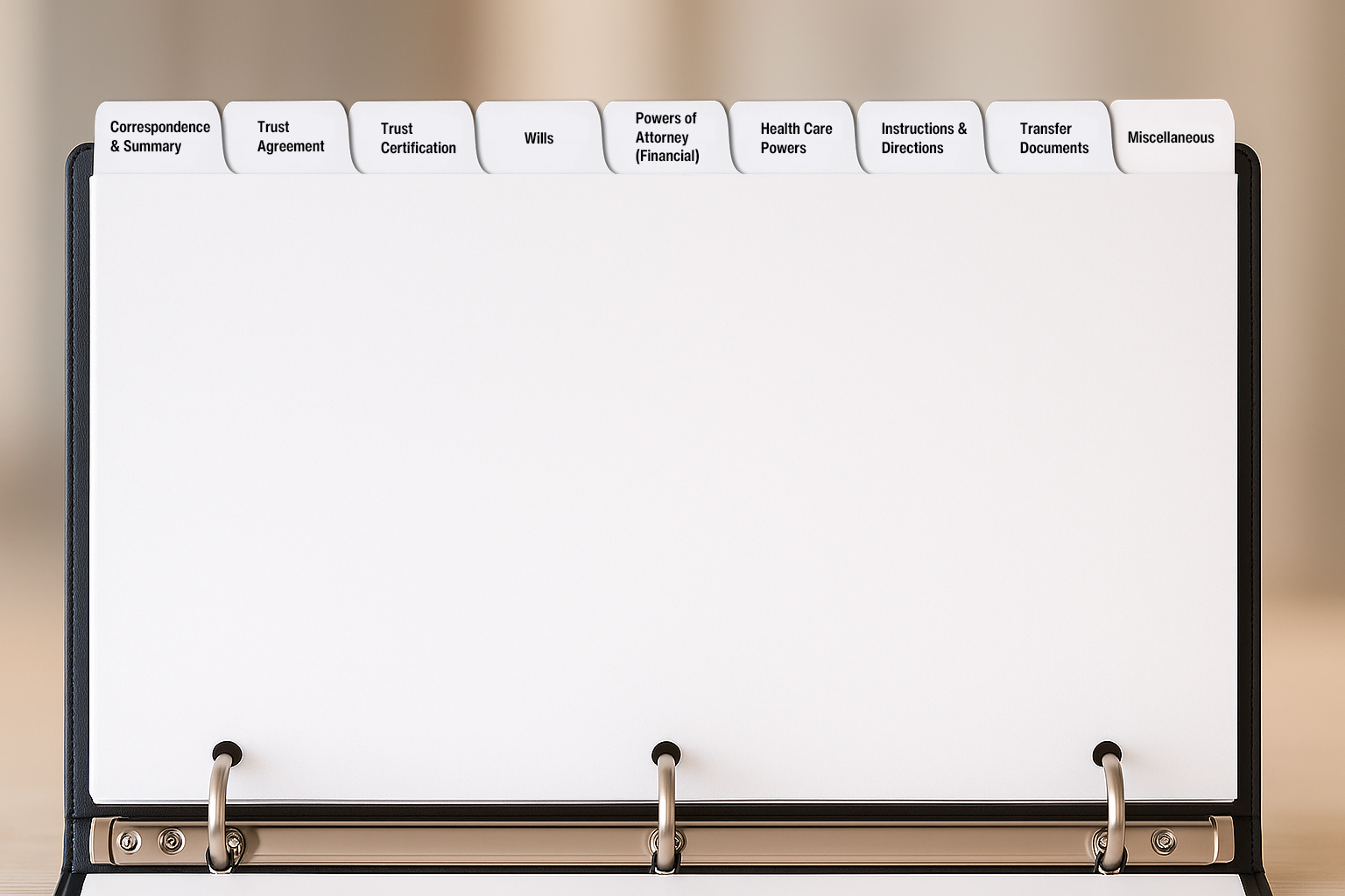 Sets of "9 cut" Index Tabs for a presentation binder with a Trust Package. The tabs are pre-printed (front and back) with the following: Correspondence & Summary, Trust Agreement, Trust Certification, Wills, Powers of Attorney (Financial), Health Care Powers, Instructions & Directions, Transfer Documents and Miscellaneous.